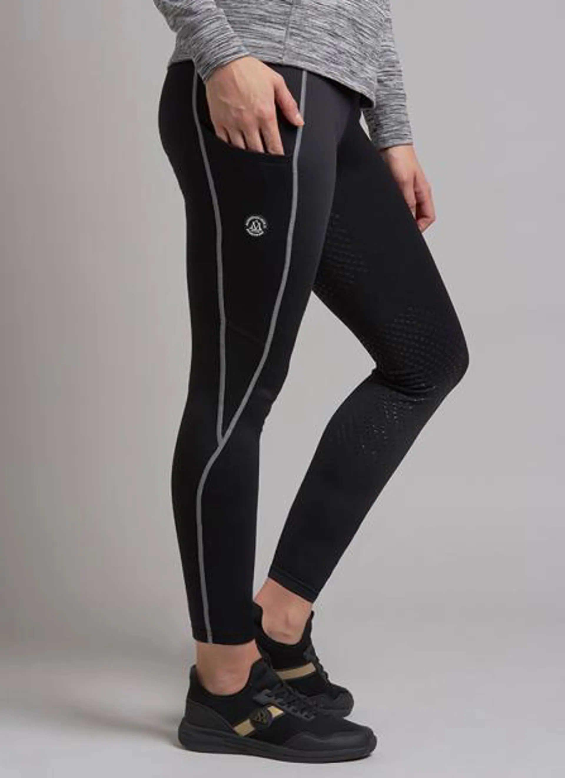 Stretchy and functional pull-on tech fleece riding tights with a cosy brushed inside. Reflective details.