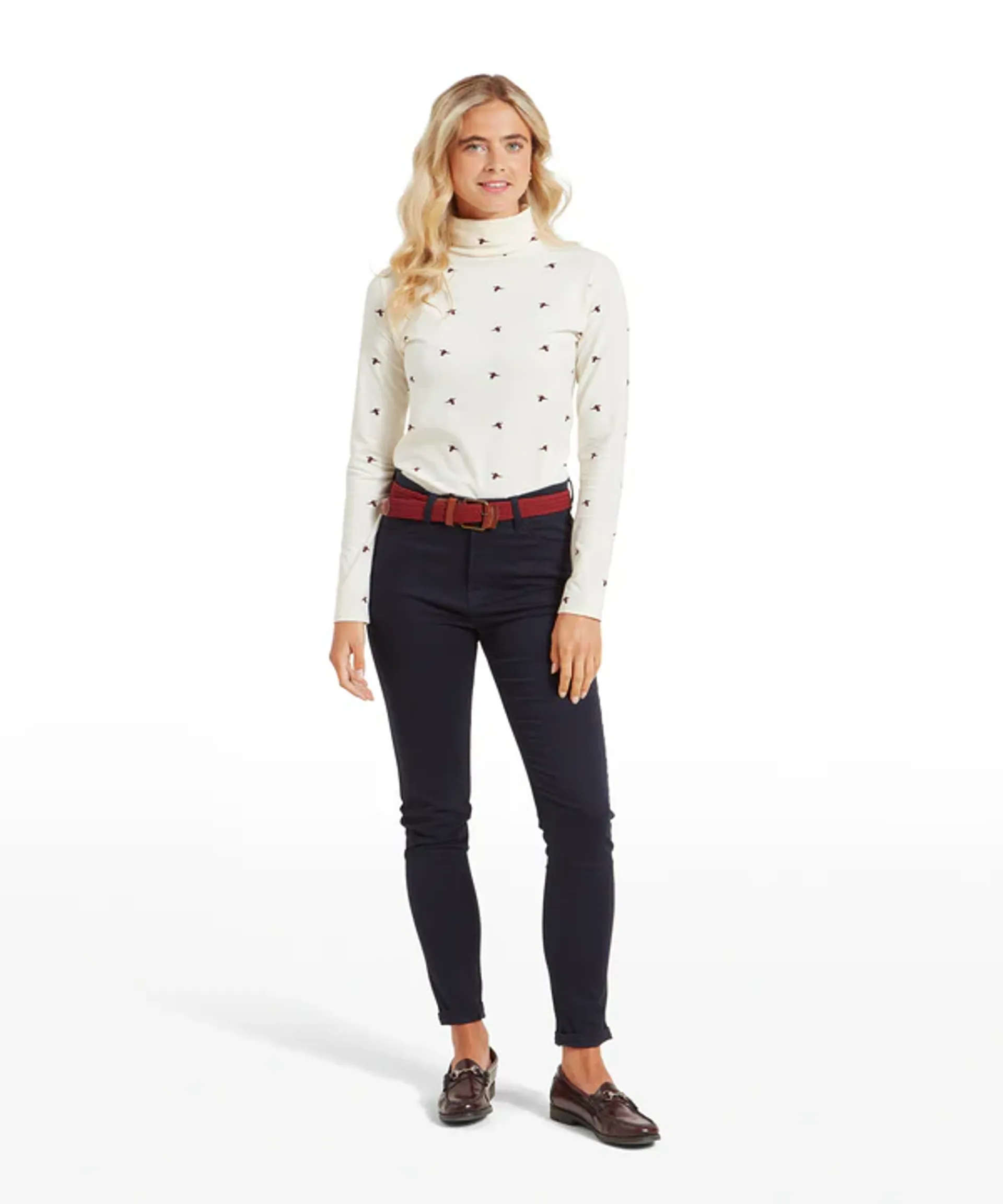 The slim-fitting women's Malham top brings together a soft stretch-jersey fabric, a roll neck, and a charming silhouette country print in an easy-to-wear layer. For a modern and sophisticated look with a hint of distinction, look no further.
