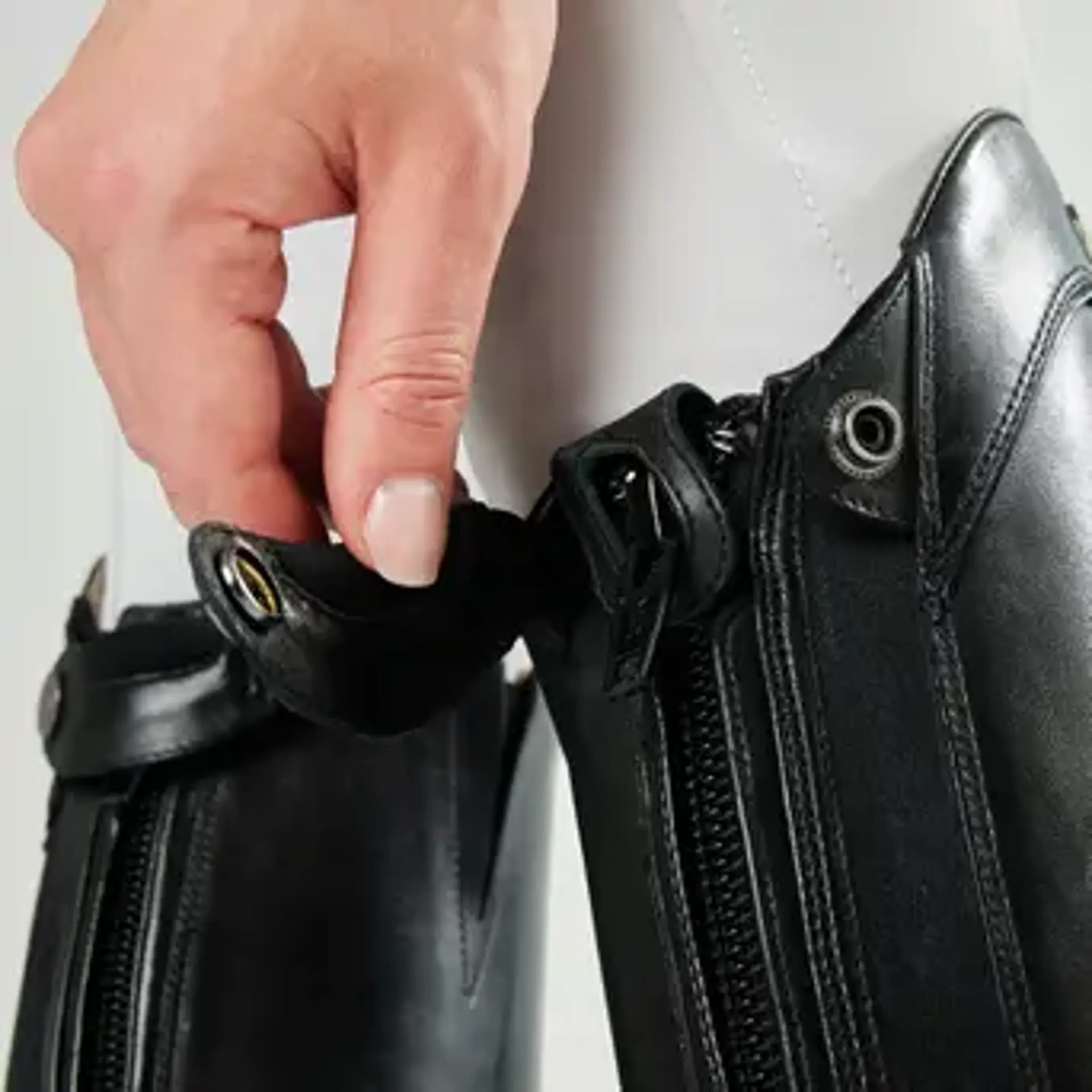 High-grade, durable elastic calf gussets offer a close fit, with streamlined and seamless elasticated front ankle lacing. A durable YKK zip runs from the back of the heel to the top of the calf behind the knee. A concealed zip keeper and sturdy zip puller make pulling on and taking off easy. A clever neoprene-cushioned cover prevents discomfort behind the knee. An integrated spur rest is mounted on the engineered zip protector flap, giving a contemporary touch.