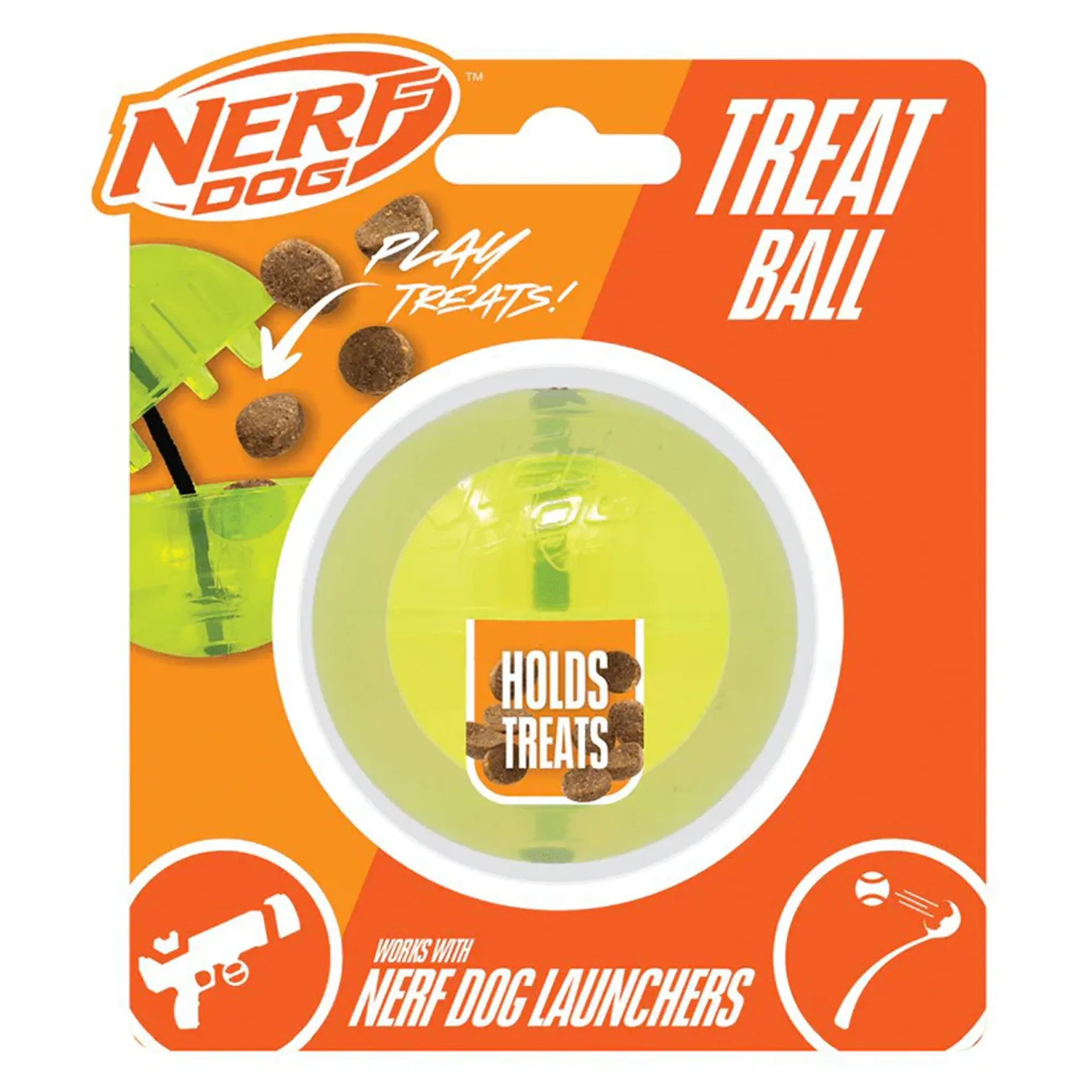 Easily load the Treat Ball with your dogs favourite treats which will then release when your dog interacts with it. The Bungee Treat Ball can be used on its own for interactive toss and fetch games or in conjunction with the Nerf Dog Tennis Ball Compact Blaster for extended playtime.